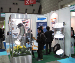 屋根の上に取り付けたドームから採光し、内面を鏡面加工した反射率の高い特注のアルミチューブを介して太陽光を室内に導く太陽光照明システム「スカイライトチューブ」の提案を行う井之商のブース。倉庫、工場、商業施設といった産業用途のほか住宅にも採用され、日中の消費電力の削減に貢献している。