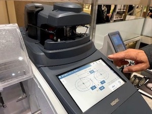 ブースでは、専用機器によるレンズのカットや視力検査の体験を実施。実際にやってみると、難しいと思わ れたレンズのカットが、驚くほど簡単な操作でできる。視力検査に至っては、ほぼ自動で機械がやってくれる。メガネショップ出店へのイメージが大きく変わるに違いない。