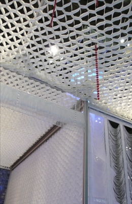 キヌガワ・パックグループは、紙の柔らかな風合いを持つ防炎認定済みの不織布「ドロップペーパー」と透過光の効果を生かし明るく軽快な空間を提案。レーザーカットで型抜きした「ドロップペーパー」をパーティションに使ったり、立体加工して天井に用いるなどさまざまな表現技法を体感することができた。切り抜きパターンや色で簡便に個性を演出できるマテリアルといえるだろう。