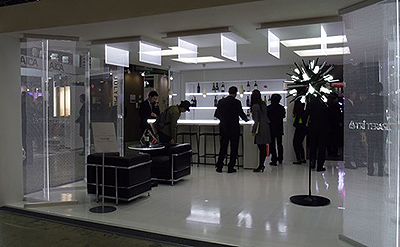 サイン向け導光板の技術を、ダイナミックな空間演出で見せているのはトライテラスだ。LEDとの組み合わせで、飲食店を想定したスパークリング感のある華やかな空間をつくりあげている。イミテーショングリーンを封入した光る受付カウンターも注目だ。