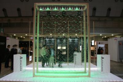 大正6年創業という愛知県の岡崎製材。多様な建材を扱う同社が、今年は「材木屋の知識を存分に活かし、新しい什器の在り方を提案したい」とチャレンジングな展示を試みた。全長7.8メートル、重さ3トンという国産ケヤキの原木をそのまま使ったロングテーブル(写真②)に、同じテイストのカウンター(写真③)。また、ラフにカットした大きな木材をフレームにしたソファやベッドなど(写真④⑤)、大胆ながらも新鮮なプレゼンテーションを展開。「独創的な発想をするデザイナーの方々と組んで、新しいものに取り組んで行きたい。そのための対応力は十分に持っています」と、担当者は前向きな姿勢を見せていた。
