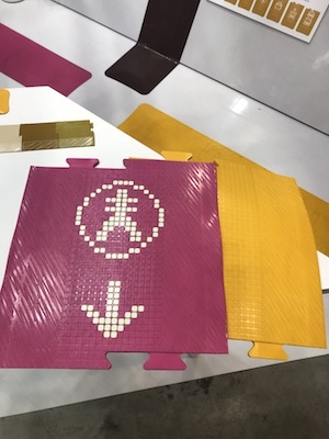 同社が開発した「歩導くん(ほどうくん)は、およそ3.5度というゆるやかな角度で物理的な負担を減らしながらも、ゴムの素材特性を十分に生かし、さまざまなカラーバリエーションを用意。床色に合わせて、組み合わせを自由に選べるようにした。