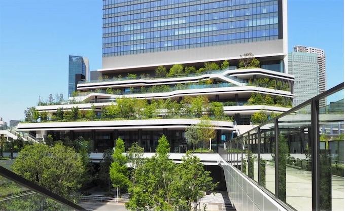 2020年9月にまち開きした「東京ポートシティ竹芝」の2~6階低層部には「スキップテラス」が設けられ、植物多様性に配慮した植栽を配し、「雨・水・島・水田・香・菜園・蜂・空」をテーマとした「竹芝新八景」が展開されている。テラスを通じて、オフィスで働く人や来館者へ"緑との親和性"を高め、子供たちへの環境教育や自然体験活動にもつなげていくという。